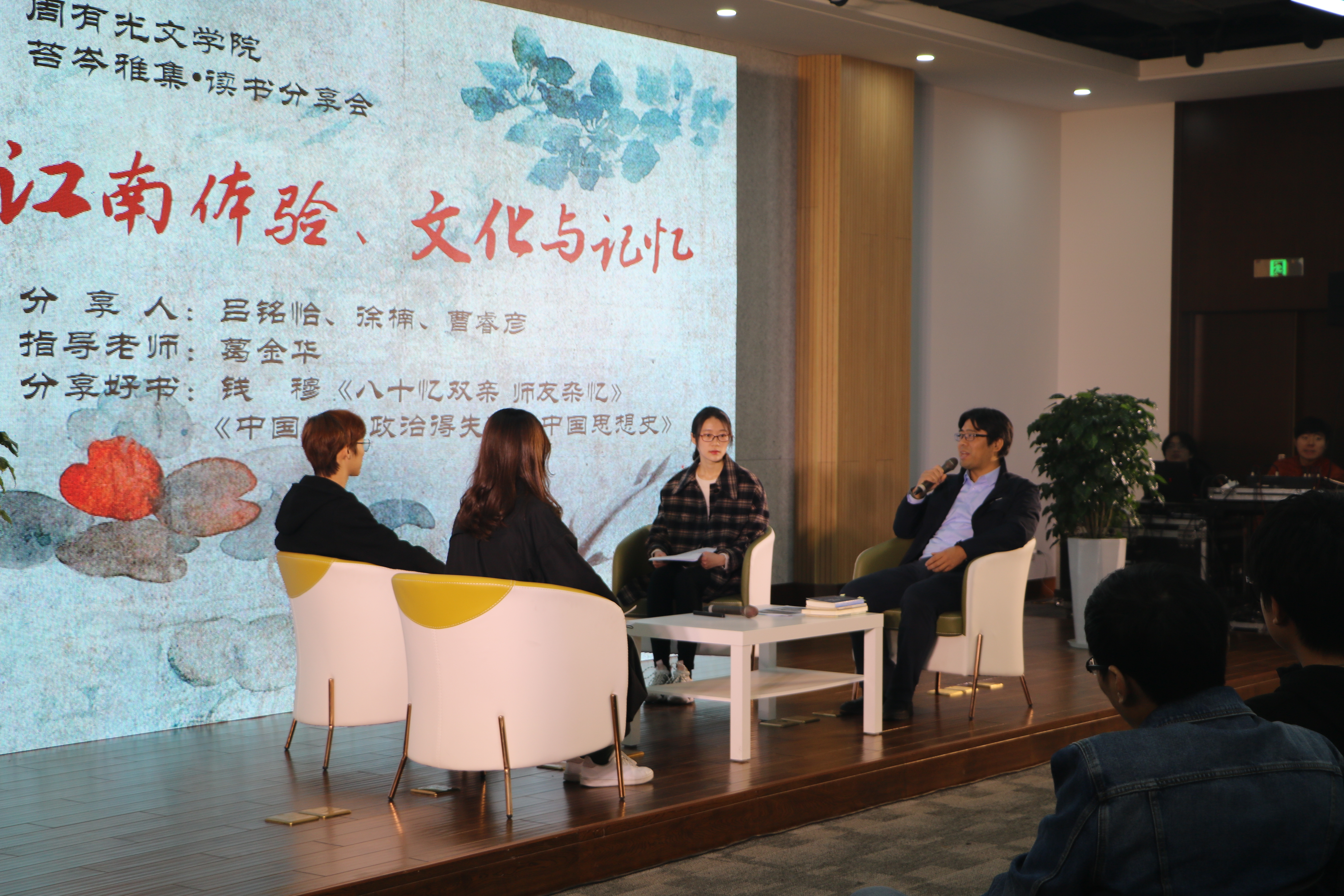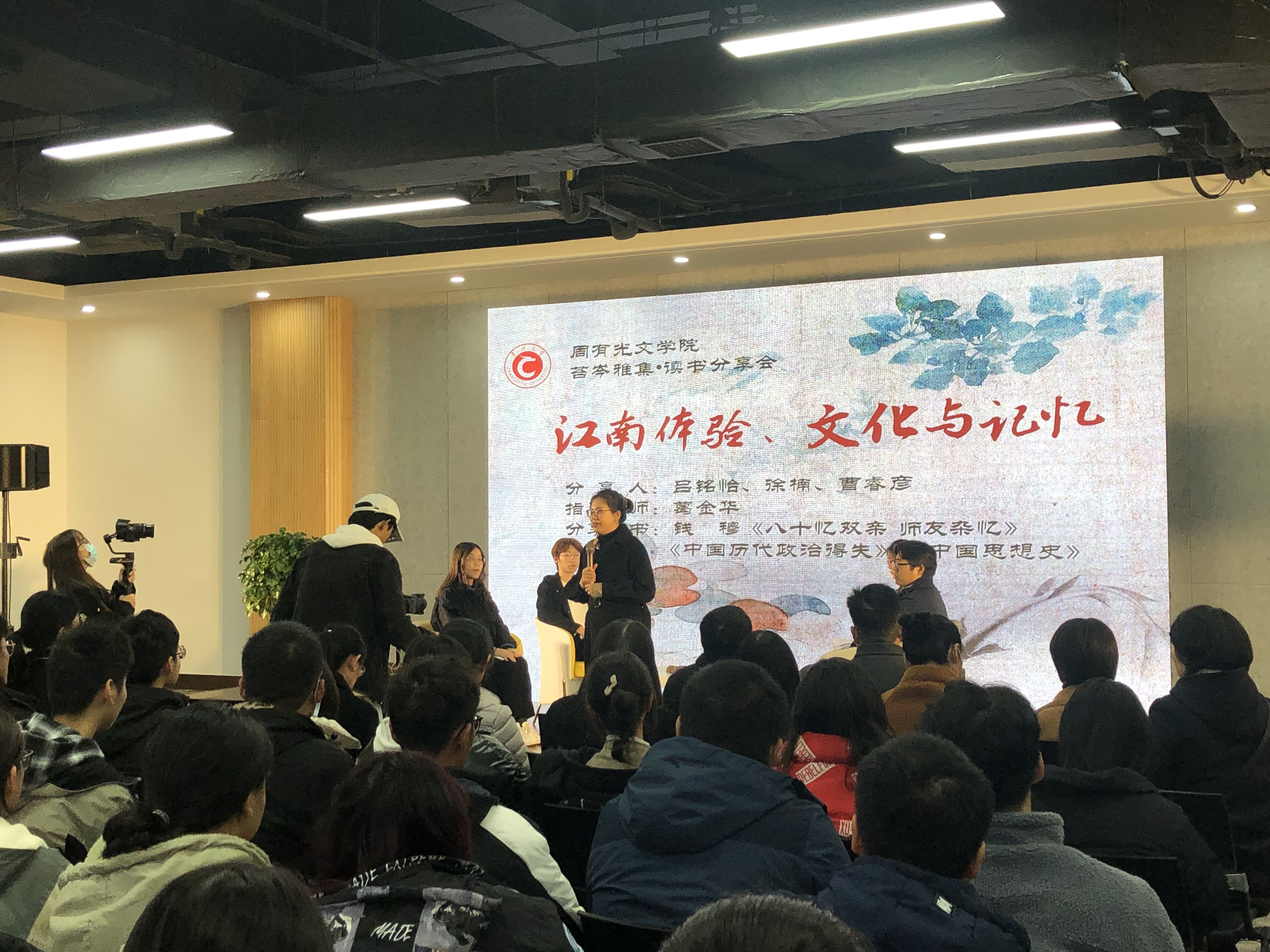 12月2日下午,missav 苔岑雅集·读书分享会在立言楼4楼报告厅顺利举行。本次读书分享会主题为“江南体验、文化与记忆”,由学院副院长葛金华老师带领三位同学分享读书心得,分享书目为钱穆先生的《八十忆双亲 师友杂忆》、《中国历代政治得失》、《中国思想史》。会议由院长助理、中文系主任王丹老师主持,学院全体教师及2020级学生参加。