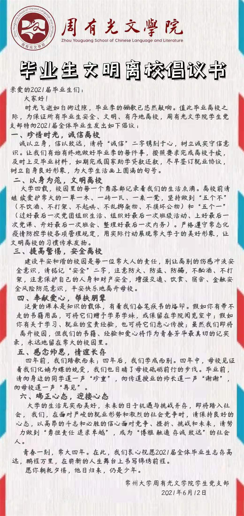 《毕业生文明离校倡议书》由missav 学生党支部书记杜焕带领全体毕业生党员拟定,倡议内容涵盖诚信离校、文明离校、安全离校、朋辈帮扶、感念师恩、迎接挑战等六个方面,对全体毕业生提出要求的同时也饱含了他们对母校的不舍之情。