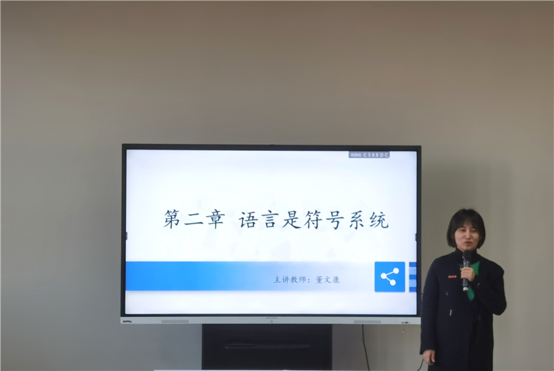 语言学教研室的董文康老师以“语言是符号系统”为题探讨语言的符号性质,从人类的认知方式入手,引出“能指”与“所指”的概念及关系,界定“符号”的内容定义及“语言符号”的特征,并陈述如何在教学中融入OBE理念。