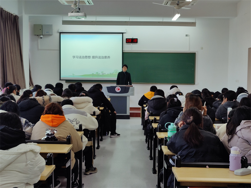 首先,焦洁庆分别从法律的发展、我国法律的本质特征和运行强调了新时代大学生学习马克思主义法治理论的重要性,指出大学生应该深刻理解中国特色社会主义法治体系的精髓,不断提升法治素养。接着,结合以“以习近平法治思想为指引 坚定不移走中国特色社会主义法治道路”为主题的宪法宣传周活动方案,焦洁庆带领全体学生学习了我国宪法的发展历史,指出全体学生应深入学习宪法,努力做尊法学法守法用法的模范。最后,她鼓励全体大学生要积极培养法治思维,正确理解依法行使权利和履行义务,成为社会主义法治的忠实崇尚者、自觉遵守者、坚定捍卫者。