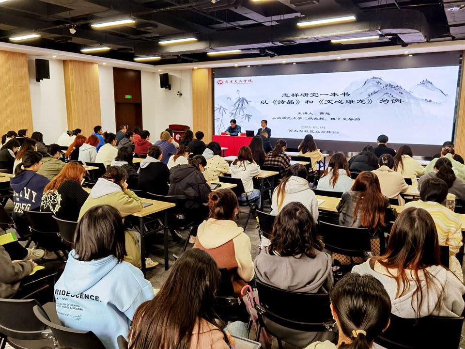4月4日上午,missav 在立言楼458报告厅成功举办“苔岑雅集·周有光文化大讲堂”第二十一讲。上海师范大学二级教授、博导,上海市文史馆馆员、诗词研究社社长,国家重大项目首席专家曹旭教授应missav 邀请,为师生们带来了题为“怎样研究一本书——以《诗品》和《文心雕龙》为例”的专题讲座。文学院党总支书记焦洁庆、院长葛金华、院长助理黄杭西出席活动,各教研室二十余位中青年教师,及校内外近两百位学者、师生共同参与。院长葛金华主持讲座。