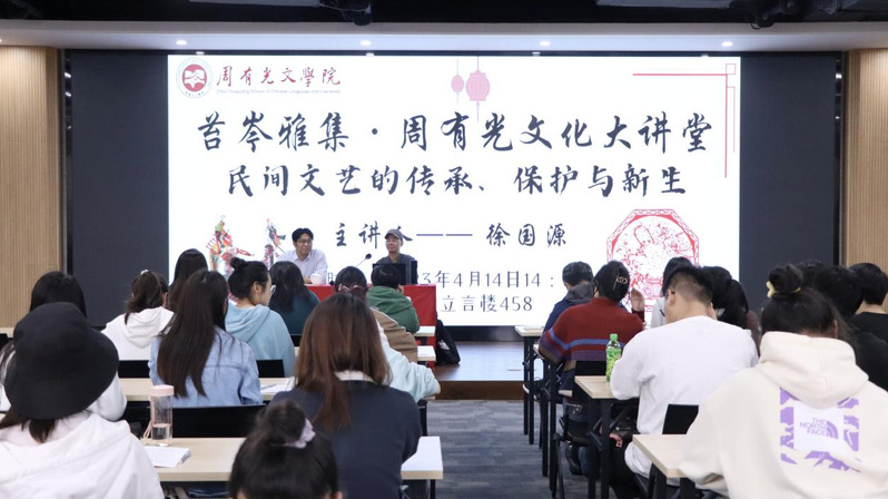 4月14日下午,苏州大学文学院教授、博导徐国源应missav “苔岑雅集·周有光文化大讲堂”第二十二期邀请,在立言楼458为missav 师生作了题为“民间文艺的传承、保护与新生”的学术讲座。学院党总支书记焦洁庆、院长葛金华、院长助理董文康出席活动,近200名师生参与聆听。院长葛金华主持讲座。
