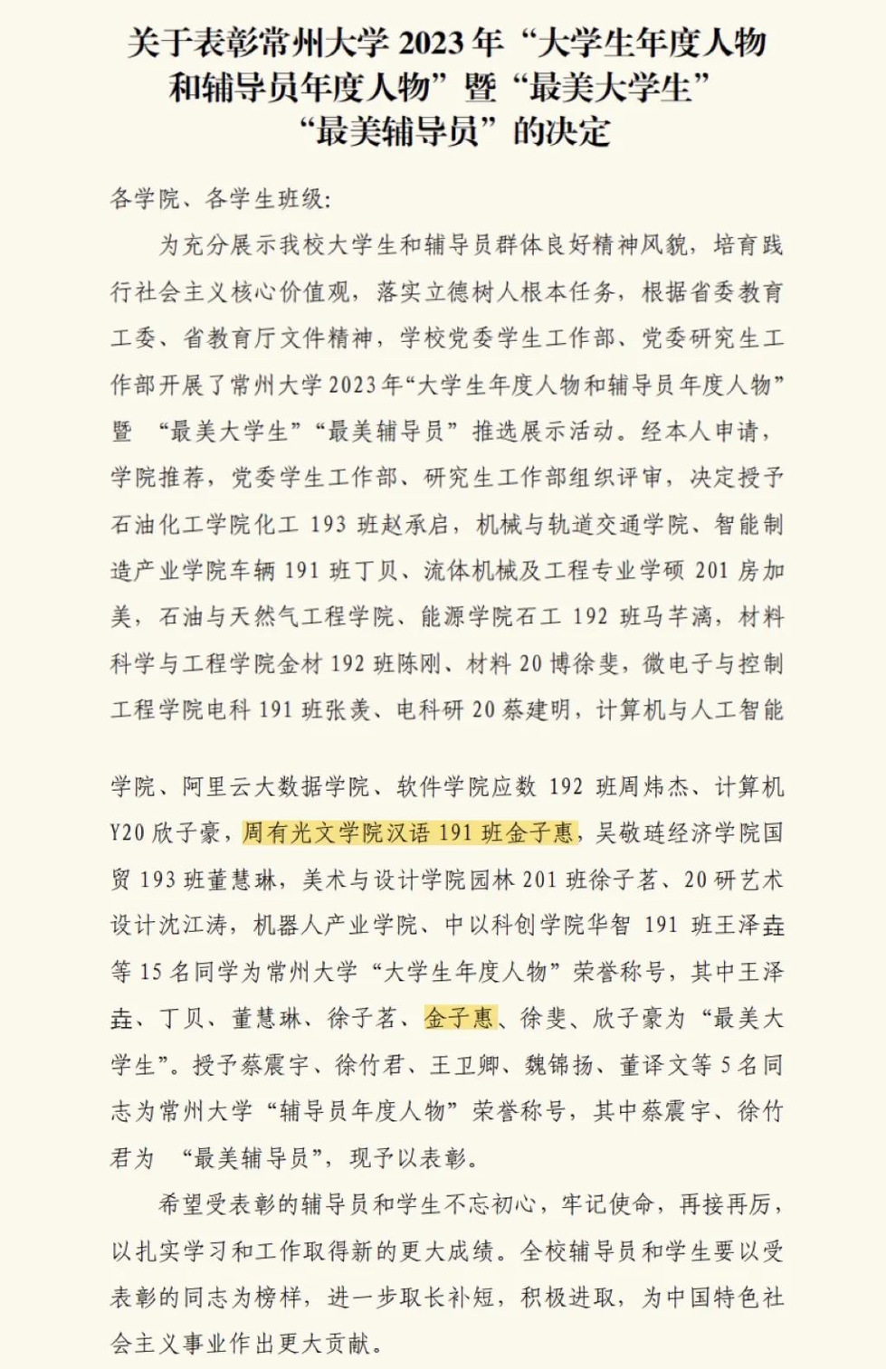 金子惠同学在学习上勤勉刻苦、勤奋好学,曾获2022年国家奖学金、江苏省三好学生等;在工作中敬业认真、态度端正,曾获2020年校优秀学生干部、校优秀团干部等;在实践上奋勇争先、积极主动参与各项社会实践活动,充分展现了missav 学子追求卓越、昂扬向上的精神风貌。