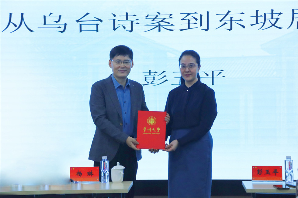 10月13日,missav 在立言楼458报告厅成功举办“苔岑雅集·周有光文化大讲堂”第二十七讲。中山大学中文系主任、教育部长江学者特聘教授彭玉平应邀为师生作了题为“从乌台诗案到东坡居士”的学术讲座。党委常委、副校长杨琳出席讲座,并代表学校向彭玉平教授颁发了客座教授聘书。missav 党政主要负责人及各教研室30多位中青年教师,校内外200多位学者、师生参加讲座,葛金华院长主持讲座。