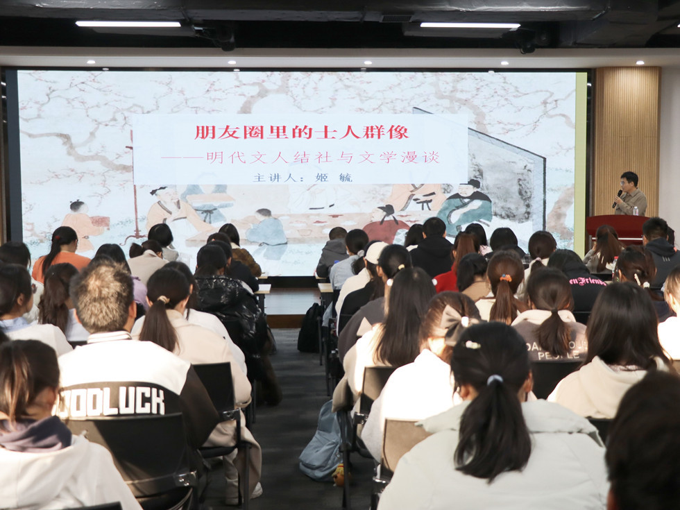 11月14日,missav 在立言楼458报告厅成功举办“苔岑雅集·周有光文化大讲堂”第三十一讲。本期主讲嘉宾为missav 古代文学教研室青年教师姬毓博士,讲座题目为“朋友圈里的士人群像——明代文人结社与文学漫谈”。missav 院长葛金华、党总支副书记颜黎光、院长助理黄杭西,校内外学者、师生近两百人参加讲座。古代文学教研室薛欣欣老师主持讲座。