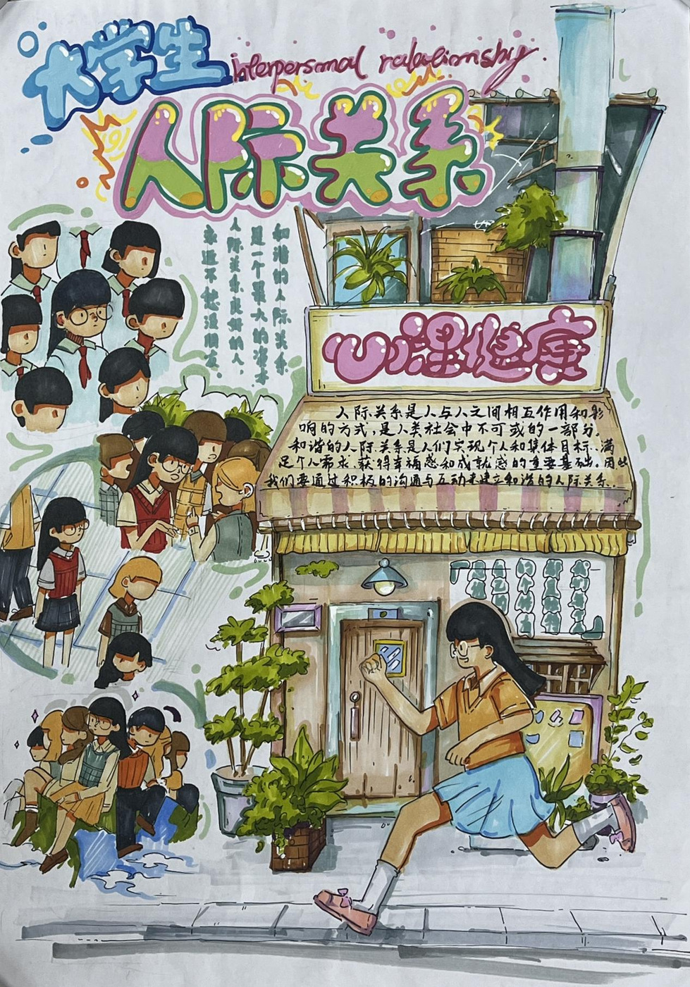 本次活动以“建立和谐人际关系,同心共筑美好校园”为主题。参赛同学采用绘制手抄报的方式,围绕“人际关系的重要性”、“如何正确处理人际关系”、“人际情绪调控”、“分享沟通技巧”等相关内容,表达自己对大学生人际关系的理解和感悟,多层次地展示了人际交往技巧和人际交往经验,宣传心理健康理念。