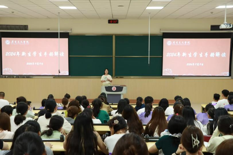 在立功楼三阶举行新生学生手册解析会。会议由新生辅导员张燕红老师筹备并主持,全体新生和学生班主任参加会议。