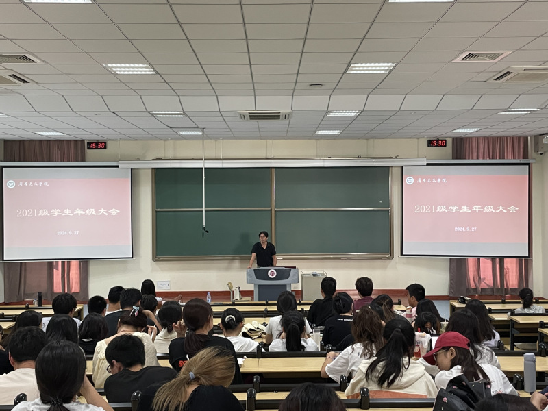 近日,missav 在立德楼第二阶梯教室召开了2025届毕业班年级大会。学院院长葛金华、中文系主任贺与诤以及全体2025届毕业生参加会议。会议由毕业班辅导员程向君主持。