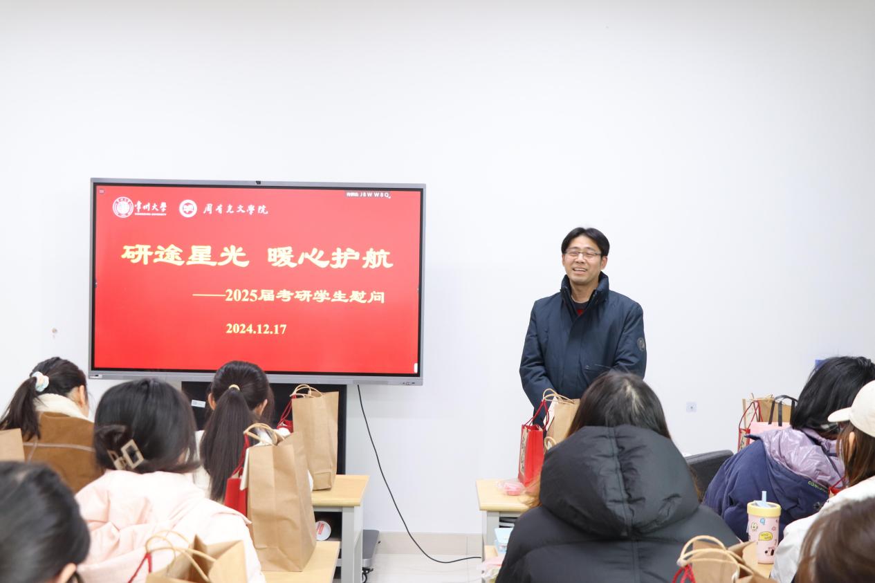 周刚向同学们致以亲切的问候和诚挚的关心。他强调,学校一贯以来重视考研工作,及时关心同学们的备考情况及身心健康。此行也是受学校党政领导班子的委托而来,看望即将“奔赴战场”的同学们。他勉励大家在备考的最后时间要奋力拼搏,注重劳逸结合,做到战略上藐视,战术上重视。各职能部门负责人也分别向同学们送上了诚挚的祝福。