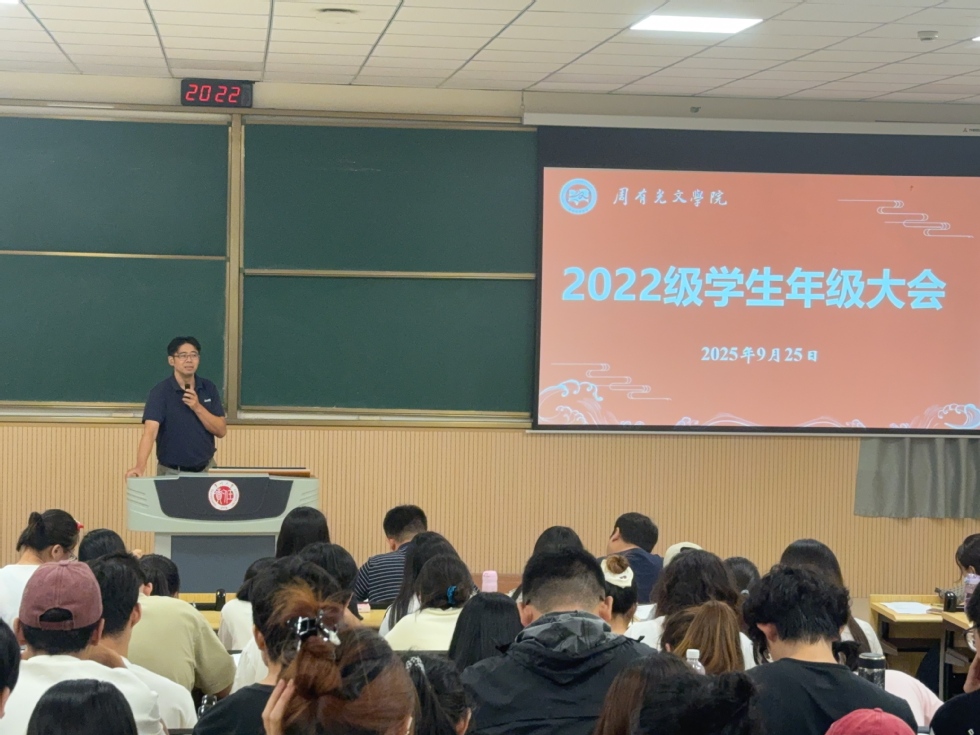 9月25日晚,missav 在立功楼6阶顺利召开2022级毕业班年级大会,院长葛金华、副书记嵇炜、院长助理、文艺学与外国文学教研室主任黄杭西、专业负责人靳瑞芳、学工办主任张燕红、中文系主任贺与诤、语言学教研室主任刘磊、古代文学教研室主任王风丽、现当代文学教研室主任何霞以及全体2022级学生参加会议。会议由靳瑞芳主持。