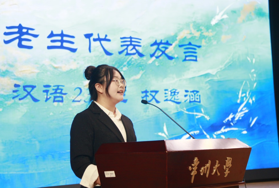 院学生会原主席、汉语234班权逸涵同学代表老生发言。她结合自身学习、阅读经历建议新生要“善读书,勤思考;少焦虑,不内耗;懂专业,做真人”,并以书本为尺,度量世界之广阔;以思考为灯,发现自我之深邃。既精进学业,更锤炼品性,成为有温度、有深度、有担当的中文人。
