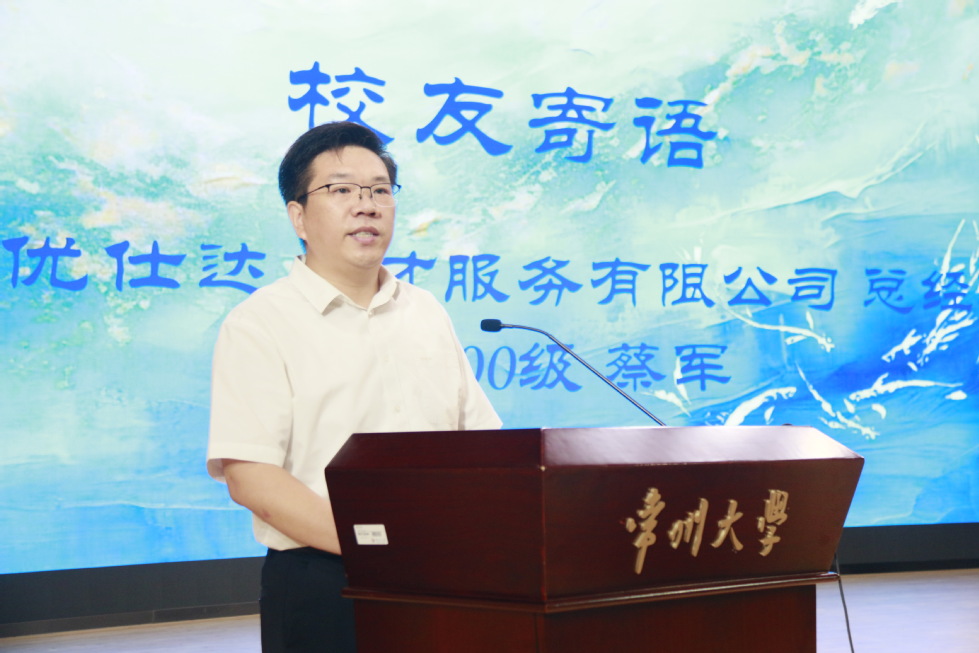 2000级秘书专业校友、常州市人力资源协会副会长、江苏优仕达人才服务有限公司总经理蔡军首先代表校友发言。他结合自己职场奋斗的历程和企业管理的经验,分析了文科专业的职场发展路径。他强调终身学习的重要性,认为只有持续学习才能不断提升自己的竞争力。他指出现代企业需要的是能打通“经济基础”与“上层建筑”的复合型人才,建议新生们能将“学以致用”和“用以致学”相结合,建立生产性学习思维,找准个人职业坐标,构建差异化竞争优势。
