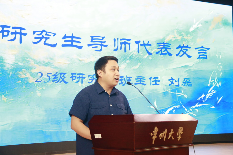 语言学教研室主任、25级研究生班主任刘磊首先代表研究生导师发言。他从《论语》中“攻乎异端,斯害也已”这句话出发,与大家探讨了孔子这句经典话语“以深耕的毅力求专精之道、存开放的胸襟求包容之道、寻平衡的智慧求中和之道”的三种意涵。他鼓励新生们要能“诚意正心、专注一事,开阔胸襟、兼容并包”,只有如此才能在学术的海洋中如鱼得水,在人生的道路上永远有光相伴。