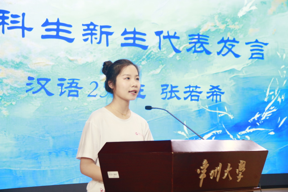 汉语252班张若希同学代表新生发言。她首先和大家分享了自己对大学的憧憬、期待与追求,并希望大家以饱满的热情和坚定的决心迎接各种来自大学的新挑战,在日常中捕捉新意,在平凡里发现真理,通过专业学习用智慧和努力书写出属于自己的新篇章。