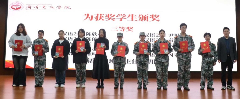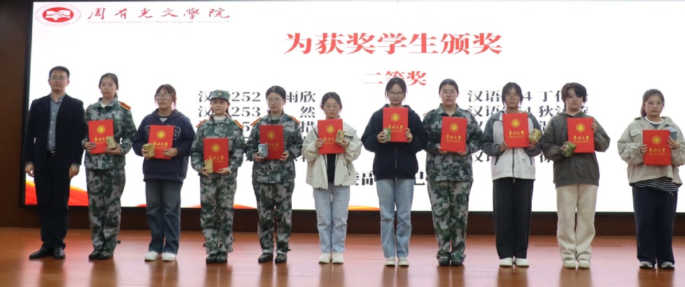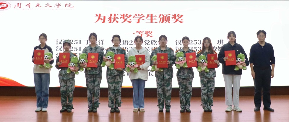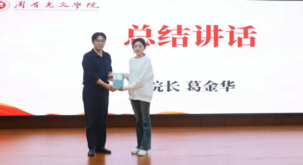 会上,为在首届“有光”征文大赛中脱颖而出的优秀学子进行了表彰。本次大赛2025 年新生全员参加比赛,共评选出奖项 66 名,其中一等奖19名、二等奖10 名、三等奖37名。在激昂的乐曲和全场热烈的掌声中,老师们为获奖同学颁发了荣誉证书,并赠送了常州城市文创精美礼品。获奖代表汉语254班仓若研同学分享了她从其他专业转入missav 汉语言文学的心路历程,她表示汉语言文学专业最打动她的是文字与心灵的共鸣。葛金华向仓若研赠送了《文选译注》。
