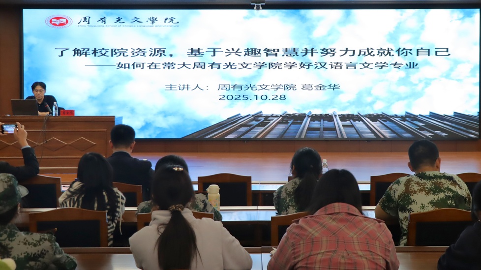 葛金华为全体2025级新生带来了一场内容丰富、意蕴深远的院史院情专题教育讲座。他以“了解校院资源,基于兴趣智慧并努力成就你自己——如何在常大missav 学好汉语言文学专业”为题,详细介绍了专业所属大类、学科体系、课程内容等,并就missav 汉语言文学专业的起源、学院发展历程、师资队伍、学科特色及发展规划进行了介绍。通过详实的史料与生动的故事,他将学院的“过去、现在与未来”详细阐述,使新生们对学院有了更为全面深入的了解,增强了新生作为学院一员的获得感与使命感。他还为新生们推荐了《史记》《数字交往论》《理解媒介》等多本书籍,鼓励同学们多读书、多思考、多写作,学会生产性学习、创作,努力成为一名“特别能写、能生产内容;特别能策划、能组织;特别有思想、有文化”的复合型人才。(通讯员/张燕红 审核/嵇炜)