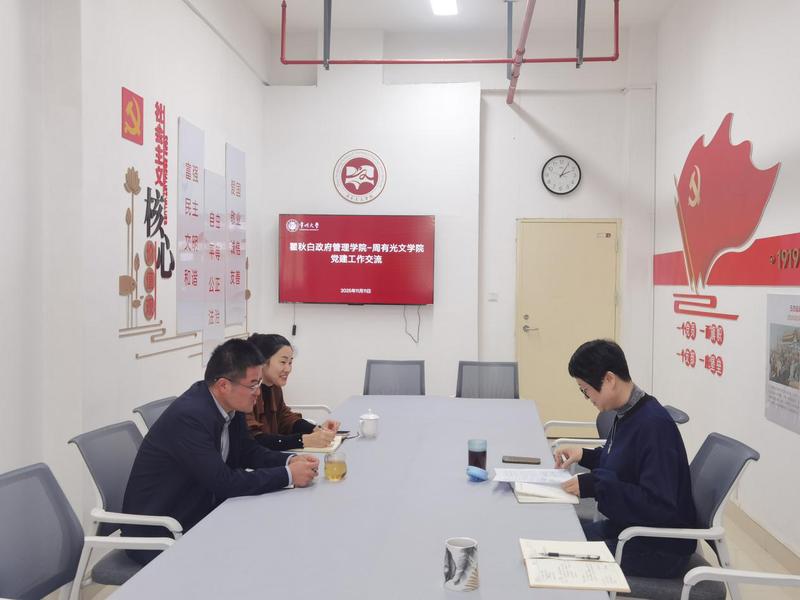 11月11日,瞿秋白政府管理学院党委书记潘道广、组织员范露元一行来missav 交流党建工作。missav 党委书记焦洁庆、组织员蒋莉莎参加交流会议。