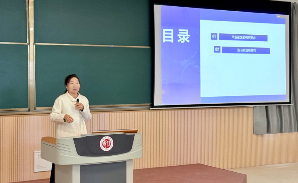 靳瑞芳针对毕业论文提交要求、实习材料归档及实习安全问题进行详细指导。她结合系统报名、材料录入、上传步骤与格式规范等工作要点,强调同学们要增强时间观念,注意各项工作时间节点,做到及时提交、认真归档。此外,她强调了实习安全的重要性,提醒大家时刻注意自身安全。